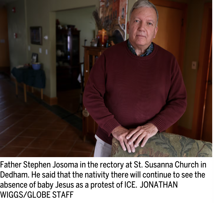 Dedham pastor stands by nativity scene protesting ICE, even as Archdiocese of Boston calls for removal By Brian MacQuarrie Globe Staff, Updated December 9, 2025, 1 hour ago DEDHAM — The Rev. Stephen